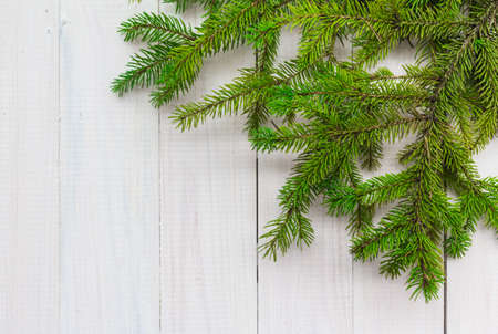 Wooden wall with Christmas tree branches. Christmas concept. Banner. Copy space.
