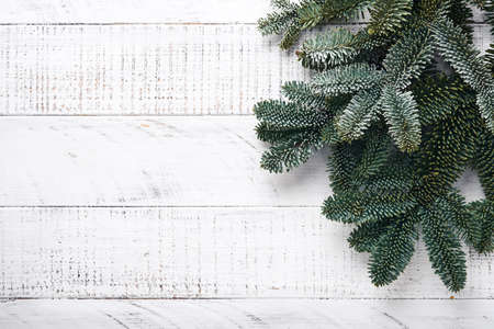 Christmas white wooden background with fir branches and glowing lights garlands. Snow in the background and spruce branches. A place for a text, a Christmas card.