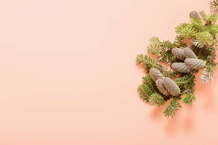 Christmas holiday background with copy space for advertising text. Fir branches on color background. Flat lay, top view.