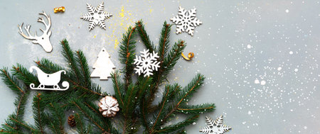 Festive gray background with sparkles. Christmas wooden figurines on fir branches. Creative copy space. Close-up