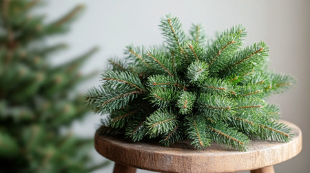 A collection of vibrant evergreen branches rests on a wooden stool, creating a natural decor piece that adds a touch of winter charm to the cozy indoor environment.