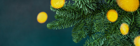 Fir branches close-up on a green background, Christmas banner with bokeh of lights, copy space