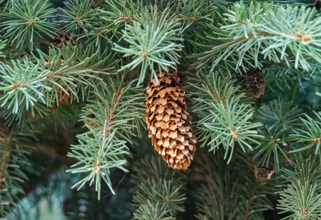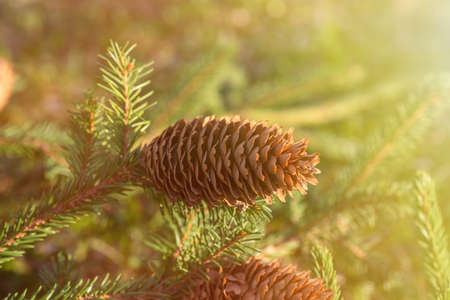 Beautiful brown round pine cones growing in the branches. Natural outdoors scenery of autumn park.