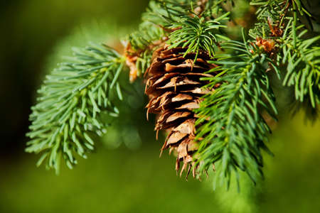 Open spruce cone close-up, front view. Green blurred background, sunlight. Macro photography of forest trees for different tasks. horizontal