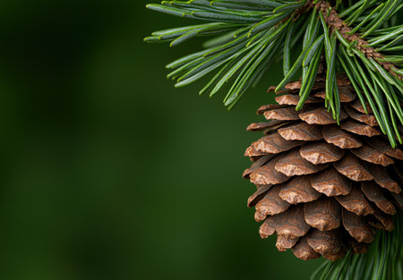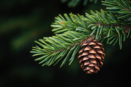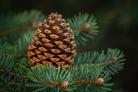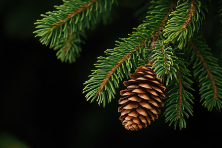 A close-up of an evergreen tree's pine cone, showcasing the intricate details and textures that make it unique among other coniferous trees. The background is dark to highlight the brownish-green color of the cones against the green branches. --ar 3:2 --v 6.1 Job ID: 8262abeb-b8d9-41e5-be42-2b25698b9779
