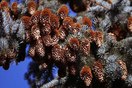 Kiev, Ukraine January 21, 2020: Cones grow in clusters on a conifer with long needles against a blue sky