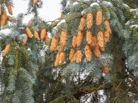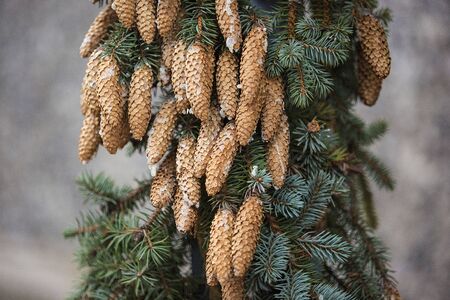 Fir branches with lots of cones in winter. Lot of fir cones on spruce branch close up