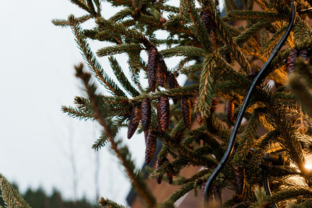 Beautiful cones grow on the green and prickly branches of the fir tree, a symbol of the Christmas season.