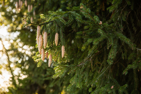 cones on the branches of a fir tree in a city park illuminated by the morning sun