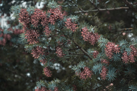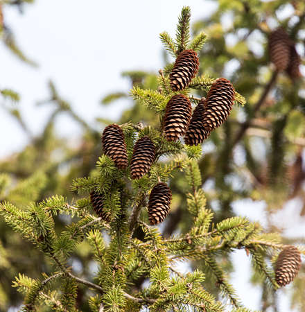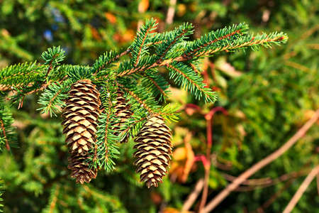 Beautiful brown round pine cones growing in the branches. Natural outdoors scenery of autumn park.