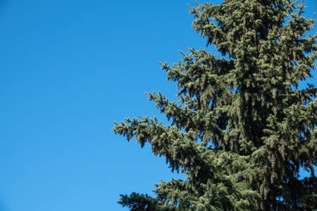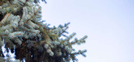 Branches of a tree a blue spruce photographed from the bottom against the blue sky. Space for text.