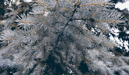 Christmas tree branches in hoarfrost with a blurred background.