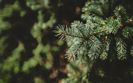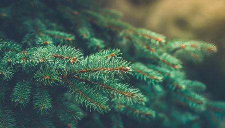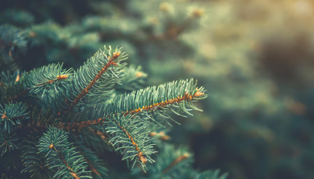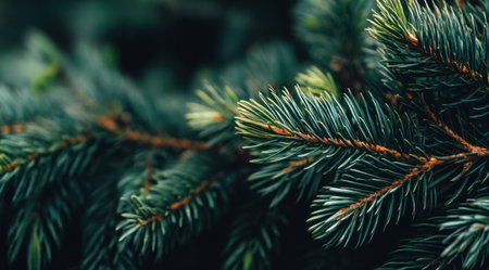 A captivating Christmas-themed image showcasing a lush green fir tree branch close-up in a trendy, moody style. Perfect for festive decor, elegant holiday cards, seasonal social media, and joyful