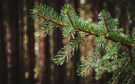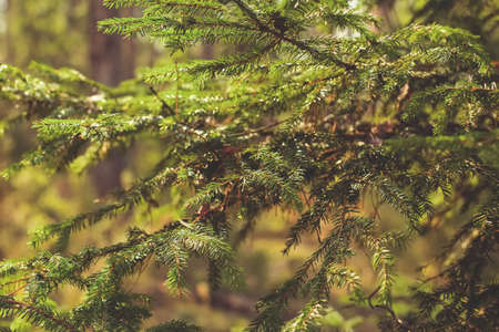 Branch of fir tree in the forest. Nature background with copy space.