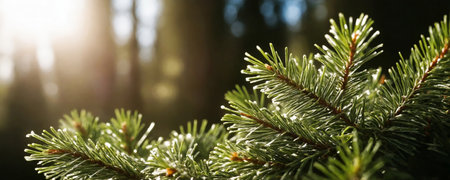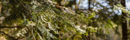 Branch of spruce tree in blurred forest, banner