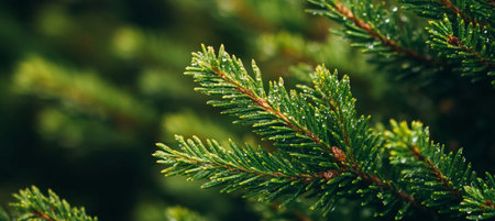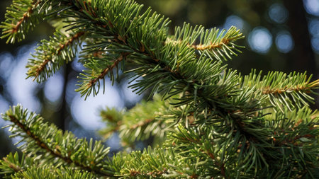 Discover the intricate details of an evergreen branch featuring lush green needles. This image captures the serene essence of nature and tranquility in the forest.