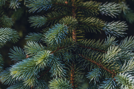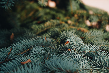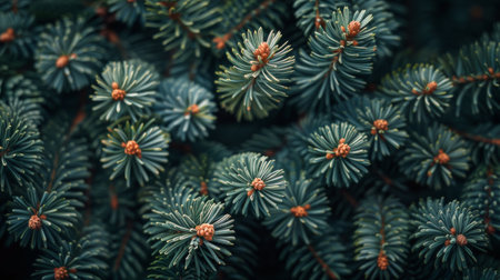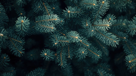 This enchanting Christmas background showcases lush green fir tree branches in an elegant close-up view, enhanced with a trendy moody aesthetic. Ample copy space ensures versatile creativity