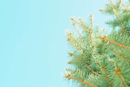 Christmas fir tree blue background with copy space. Fir tree branches texture.
