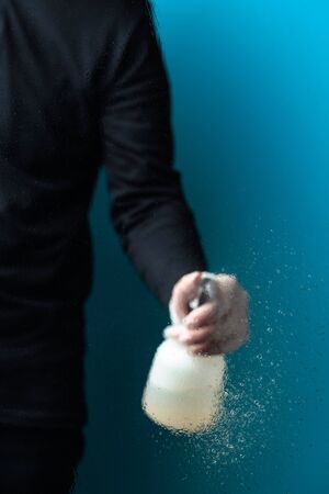 A blue antiseptic with a spray of sperm solution is located in human hands on a white matte background.