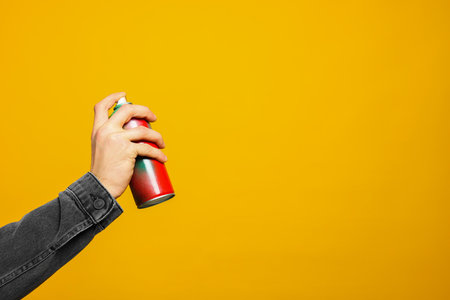 Man holding can of spray paint on yellow background, closeup. Space for text