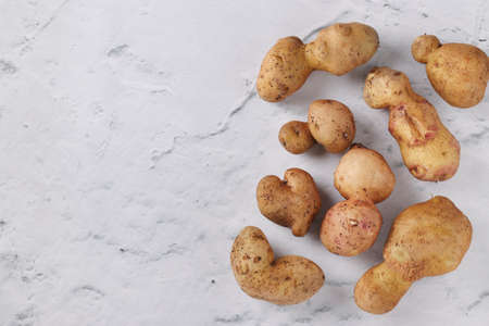 Ugly organic abnormal potatoes on marble background, Concept organic vegetables, Copy space