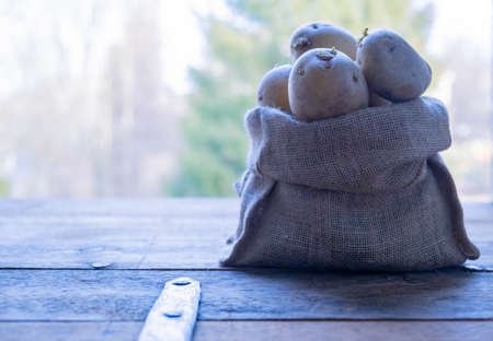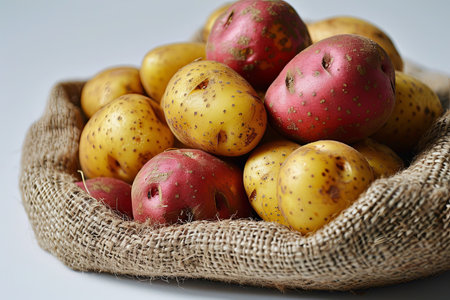 Natural organic fresh potatoes harvest in burlap sack on white background
