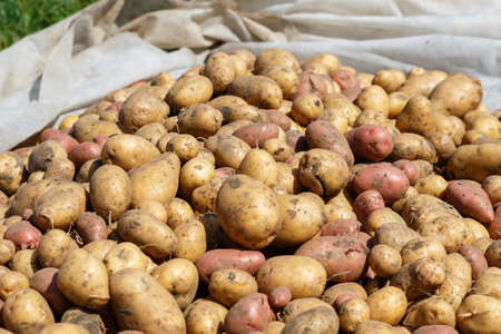 Pile of organic freshly harvested potatoes. Autumn harvest on a farm