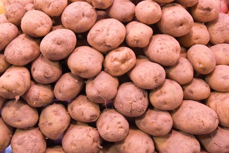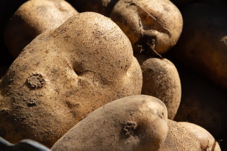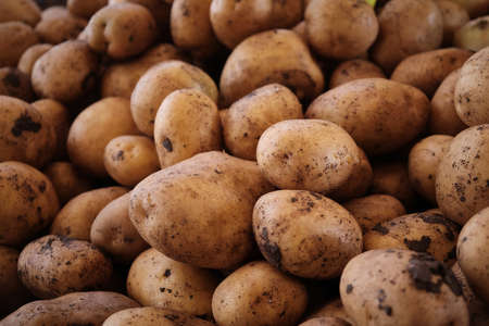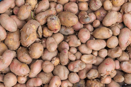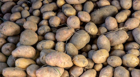 Fresh raw potatoes with natural skin piled at the market. Organic root vegetable for cooking, frying, and traditional meals