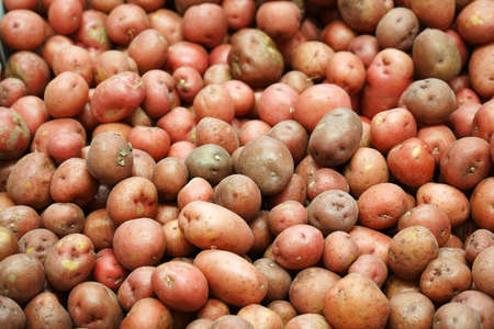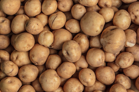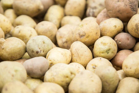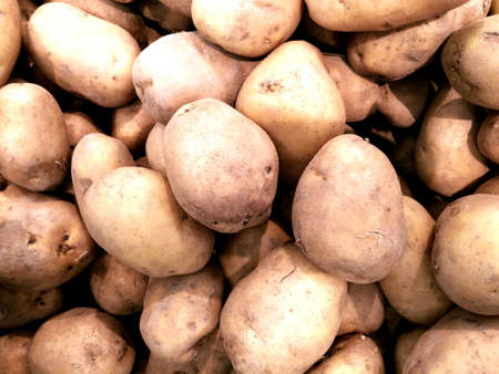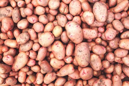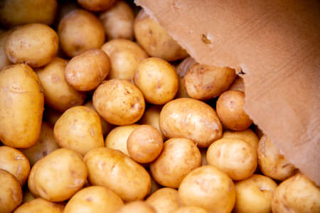 Food Vegetables Fresh New Potatoes, Background. Potatoes pattern for sale in market. Agriculture and vegetables product.