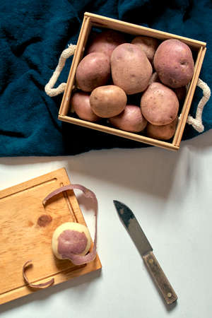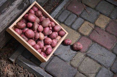 Top view of a wooden crate with fresh harvested crop of organic pink potatoes on a wooden rustic door background