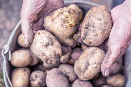 Fresh potatoes in old elderly farmer's hands above the bucket. Toned image