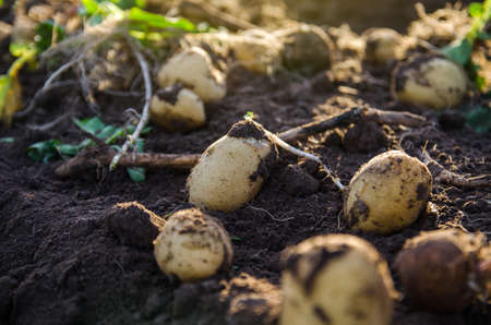 Fresh potatoes on ground. Freshly dug organic potato vegetables lie on moist, loose ground with tops. Gardening and farming. Agricultural production. Bountiful harvest Growing food on the farm field.