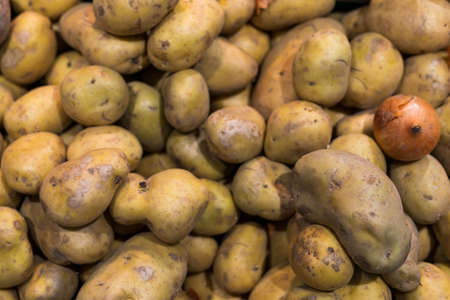 Fresh organic potato stand out among many large background potatoes in the market. Close-up potatoes texture.