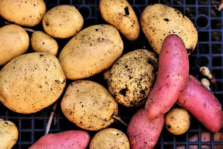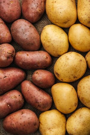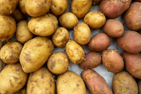 Fresh harvest of white and red potatoes in different sizes close-up.