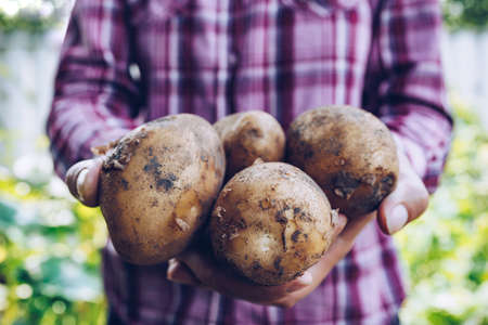 Potatoes. Farmer holding freshly harvest potatoes in hands on farm. Healthy organic vegetables.