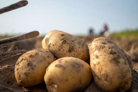 Freshly harvested organic potato crop. Farmer in the garden. selective focus