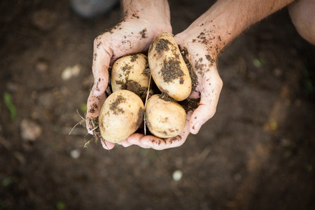 Cropped image of male gardener holding dirty fresh organic potatoes at farm