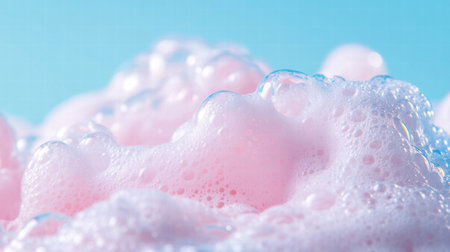 Soft pink bubbles rise and form a frothy layer against a gentle blue backdrop, creating a fun and relaxing atmosphere in a bath setting.