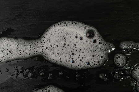 Detergent foam texture background. Lather pattern, soap bubbles on black stone surface, soap foam wallpaper with copy space