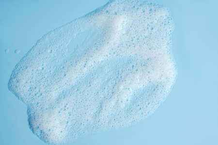Face cleansing mousse sample. White cleanser foam bubbles on blue background. Soap, shower gel, shampoo foam texture closeup.