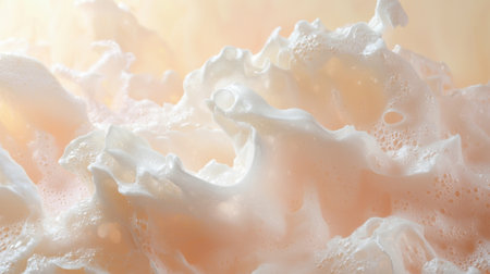 Soft, creamy waves of froth gently blend together in a pastel setting, evoking a sense of tranquility and lightness. The delicate texture creates a dreamy visual effect.
