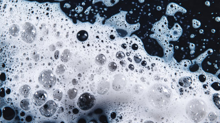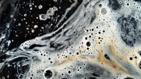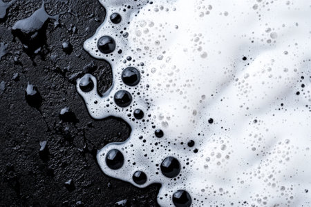 close up view of white and black foam on marble surface creates striking contrast, evoking sense of cleanliness and freshness. bubbles add texture and depth to image.
