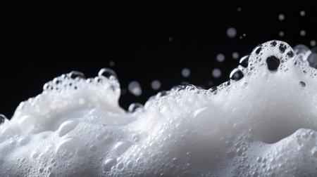 White foam is overflowing and creating bubbles on a black background, suggesting concepts of cleanliness, hygiene, and effervescence. Ai generated image