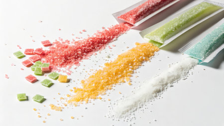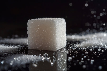 White sugar cubes falling onto a pile of brown sugar granules, creating a dynamic scene on a dark background, highlighting the concept of sugar consumption and its variations