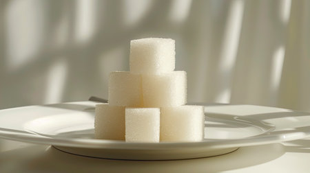 Crisp white sugar cubes neatly stacked on a pristine white plate with soft shadows