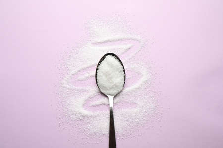 Minimalist flat lay composition sugar and spoon on the dark background. Medical, Healthcare and Diabetes Concept. Top view and selective focus.