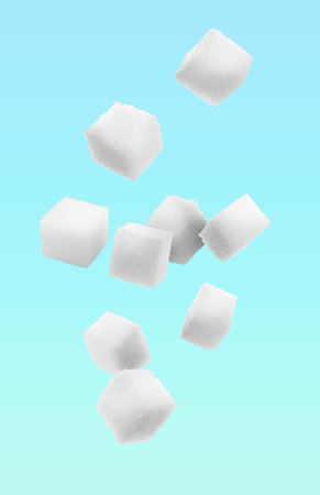 Falling sugar from spoon on turquoise background, symbolizing sugar reduction and health risks
