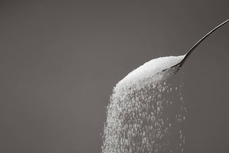 Hand pouring sugar from a spoon, with sugar crystals falling, symbolizing the concept of sugar reduction, no added sugar, and a low sugar lifestyle for better health