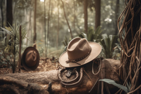 outdoorsy scene with cowboy hat, rope and horse out in the wild, created with generative ai