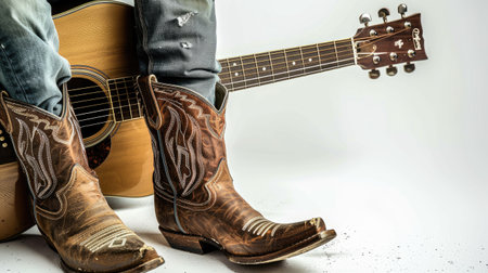 a cowboy hat, lasso, and boots set against a white background, accompanied by a guitar, evoking the spirit of the Wild West and the soulful tunes of country melodies